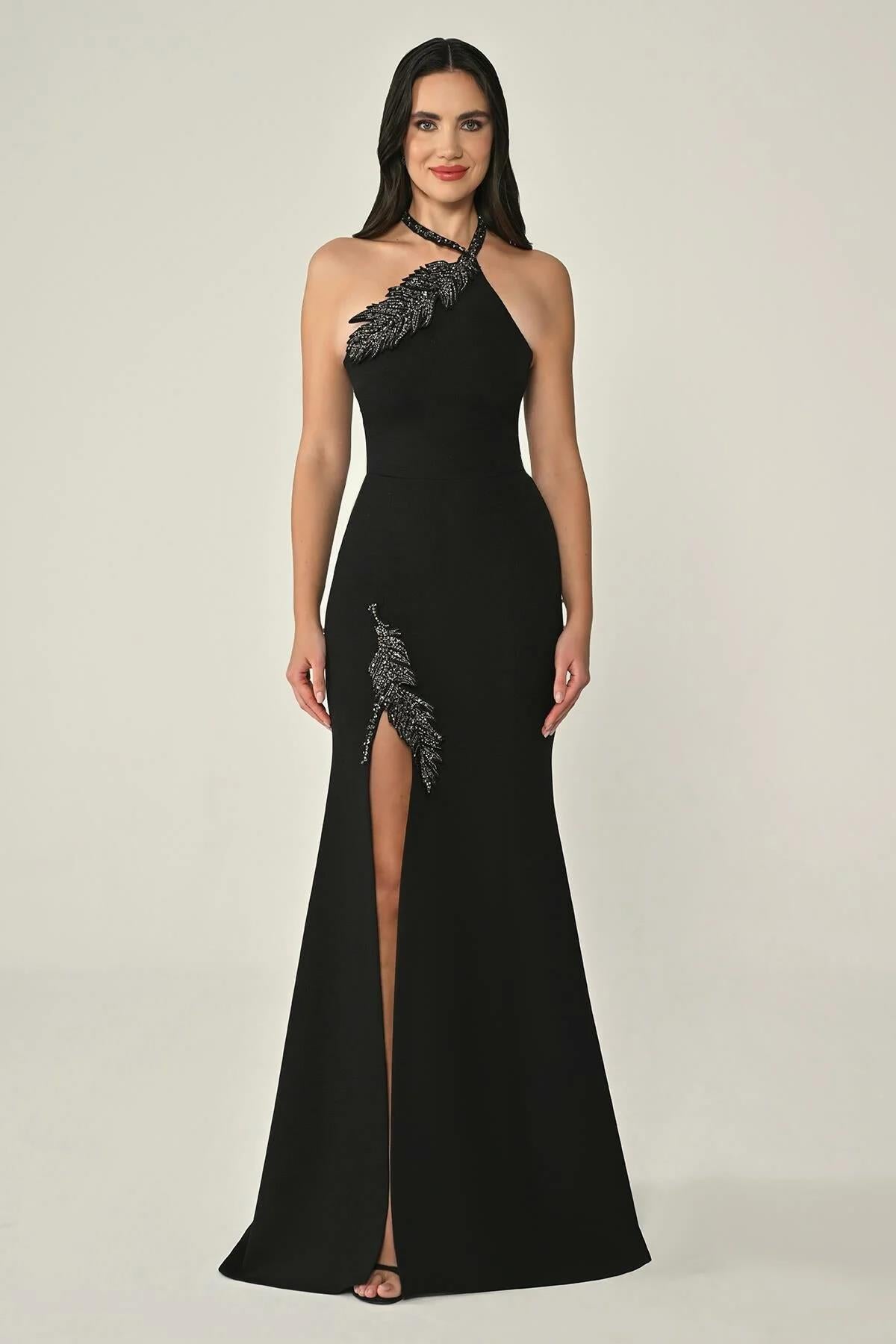 Derin V Yaka Uzun Kollu Yırtmaçlı Uzun Abiye Elbise