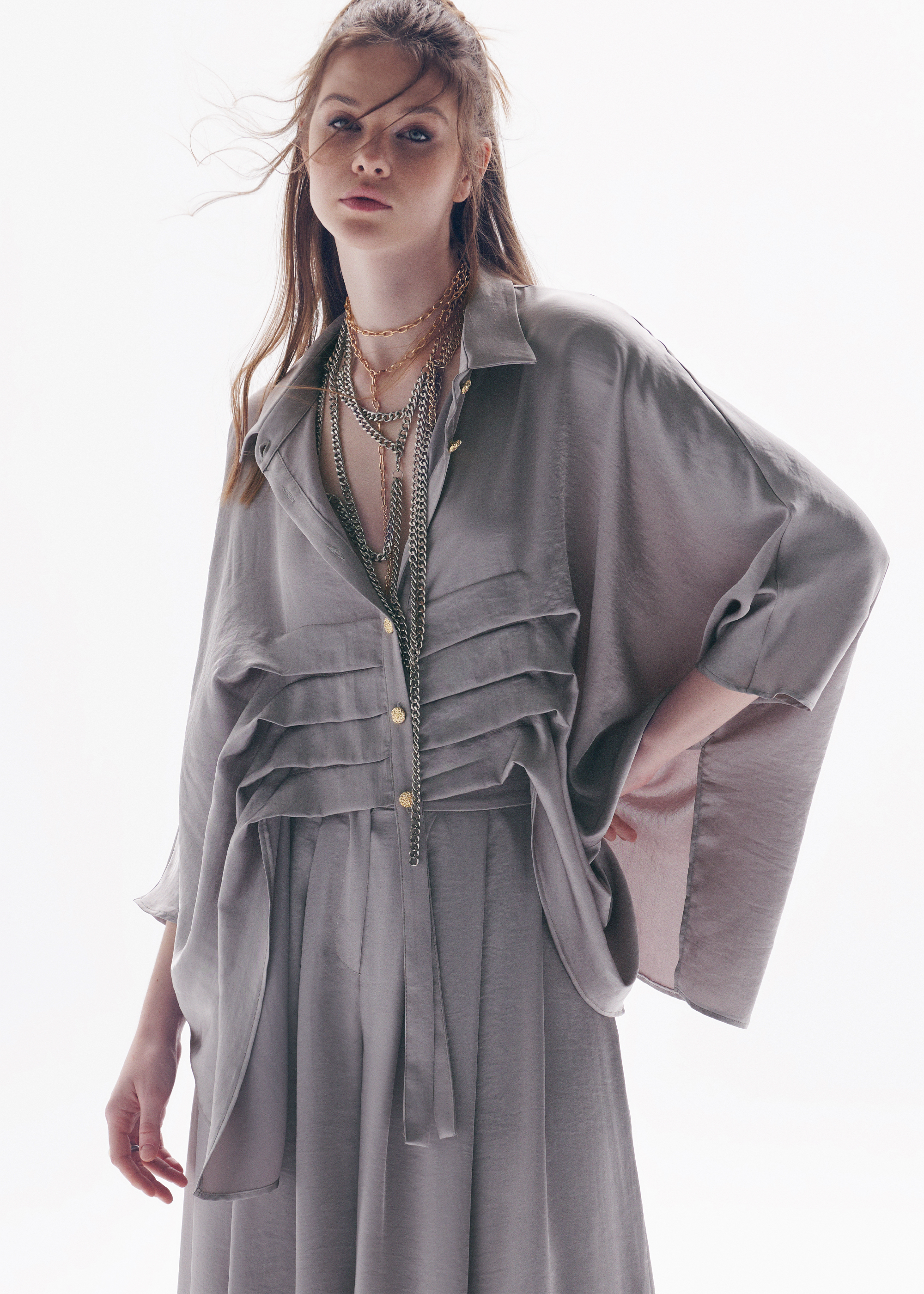 Satin Jacket with Gathered Sleeves and Decorative Buttons