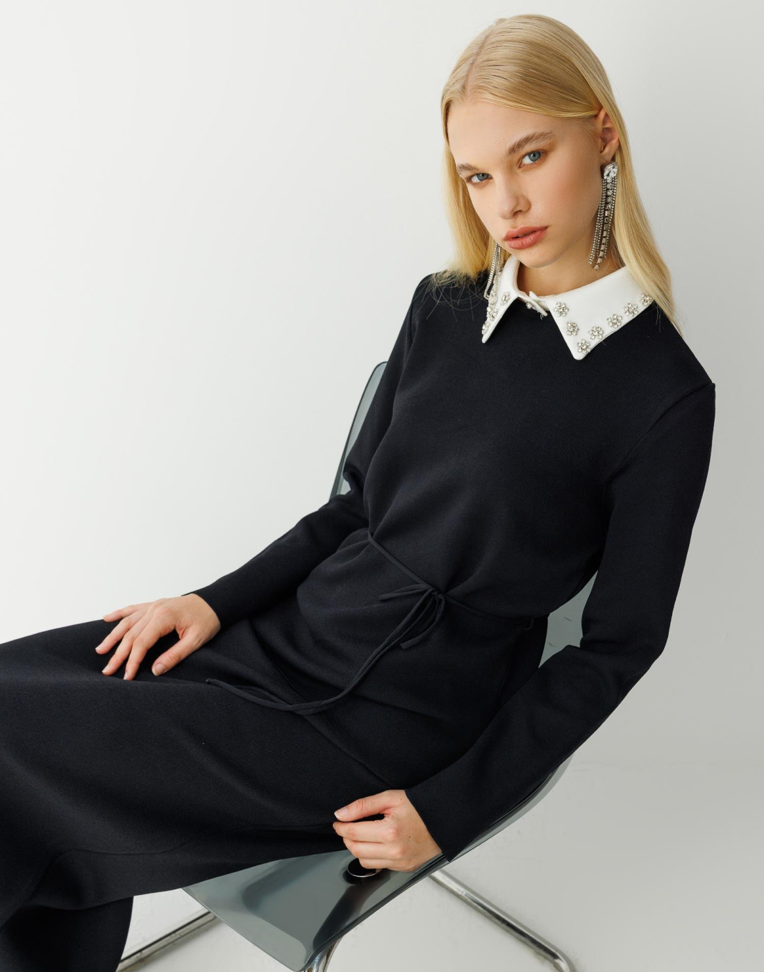Midi Evening Dress with Window Detail on the Collar and Slit in the Front