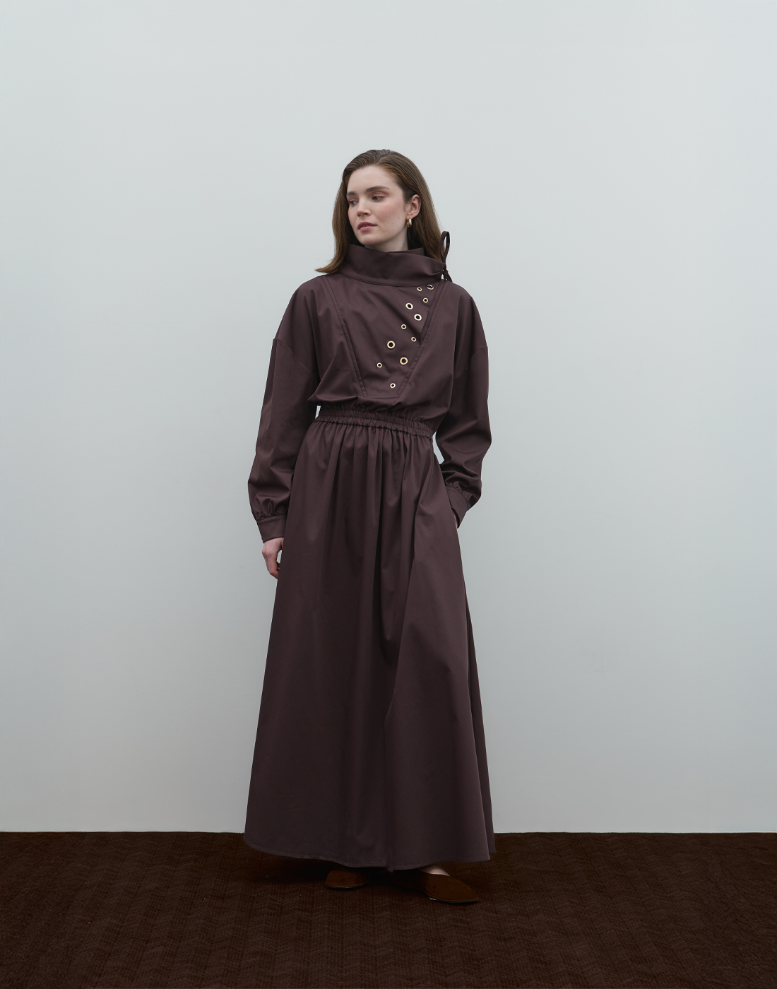 Poplin Long Dress with Metal Ring and Gathered Detail